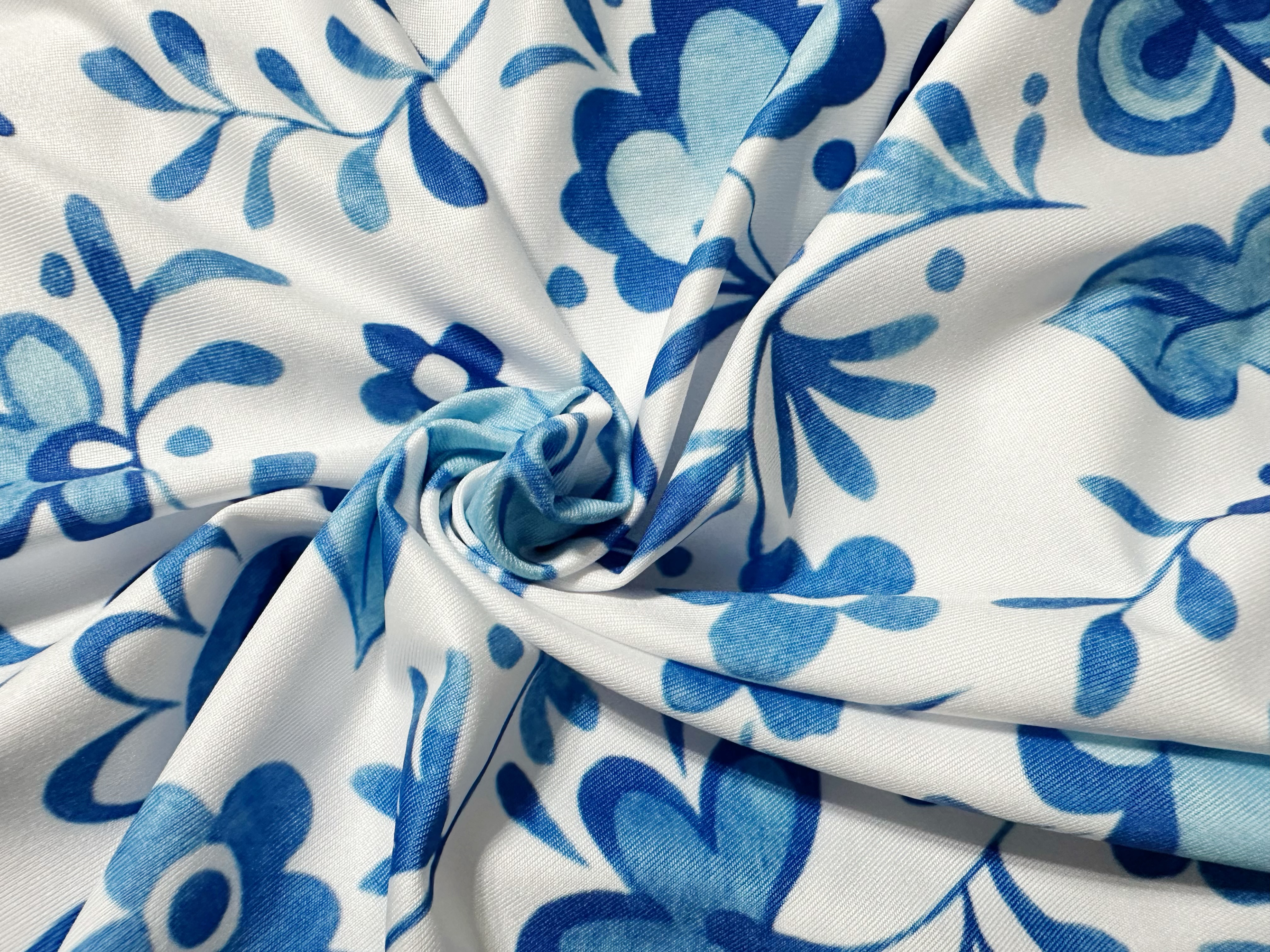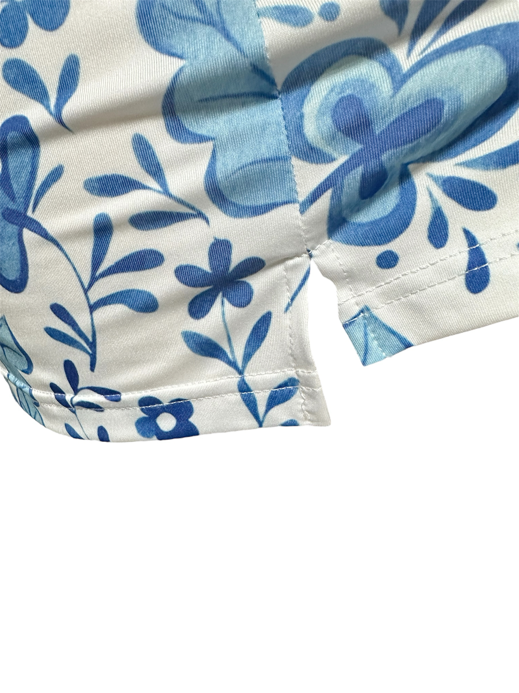 這款印花靈感取自盛夏的藍色花園,以手繪筆觸描繪出花與葉的自然律動。